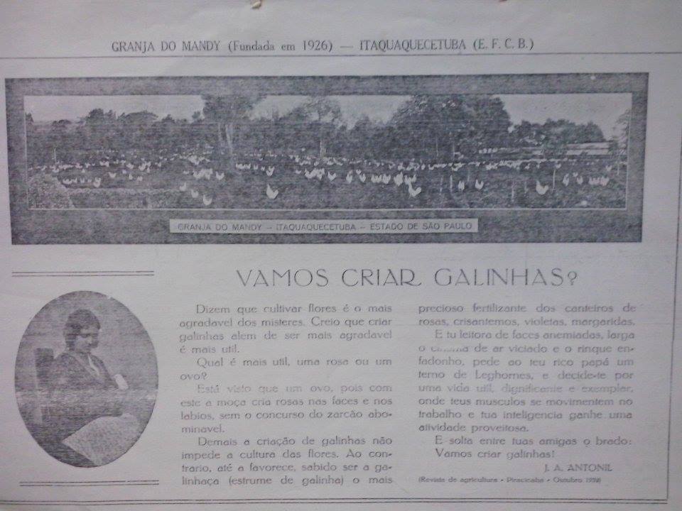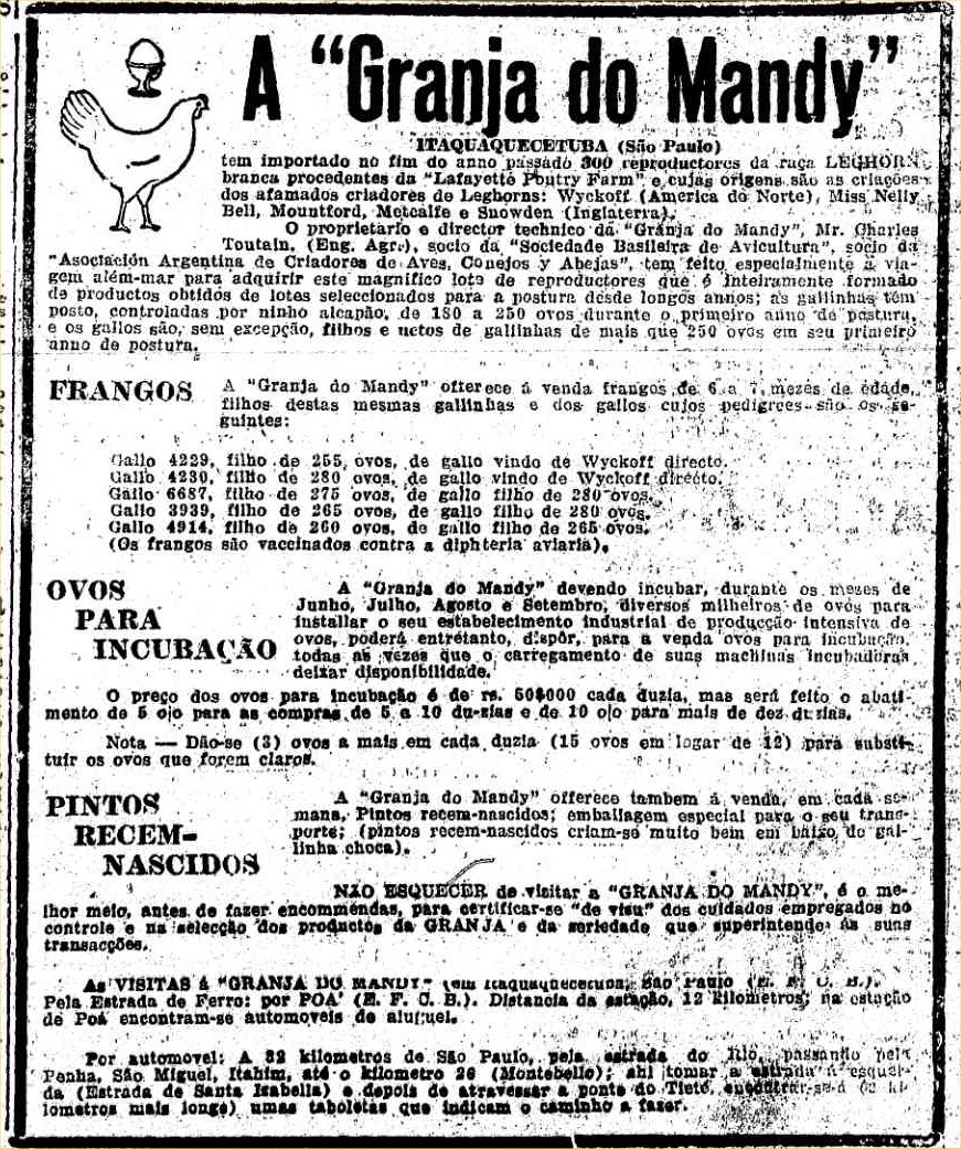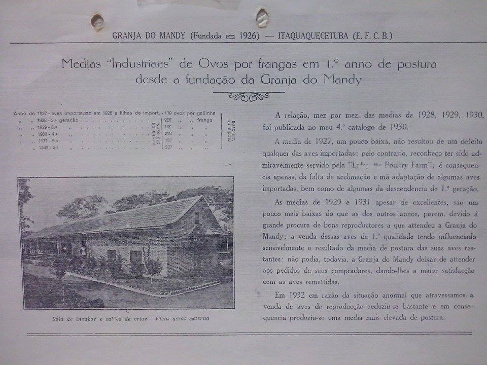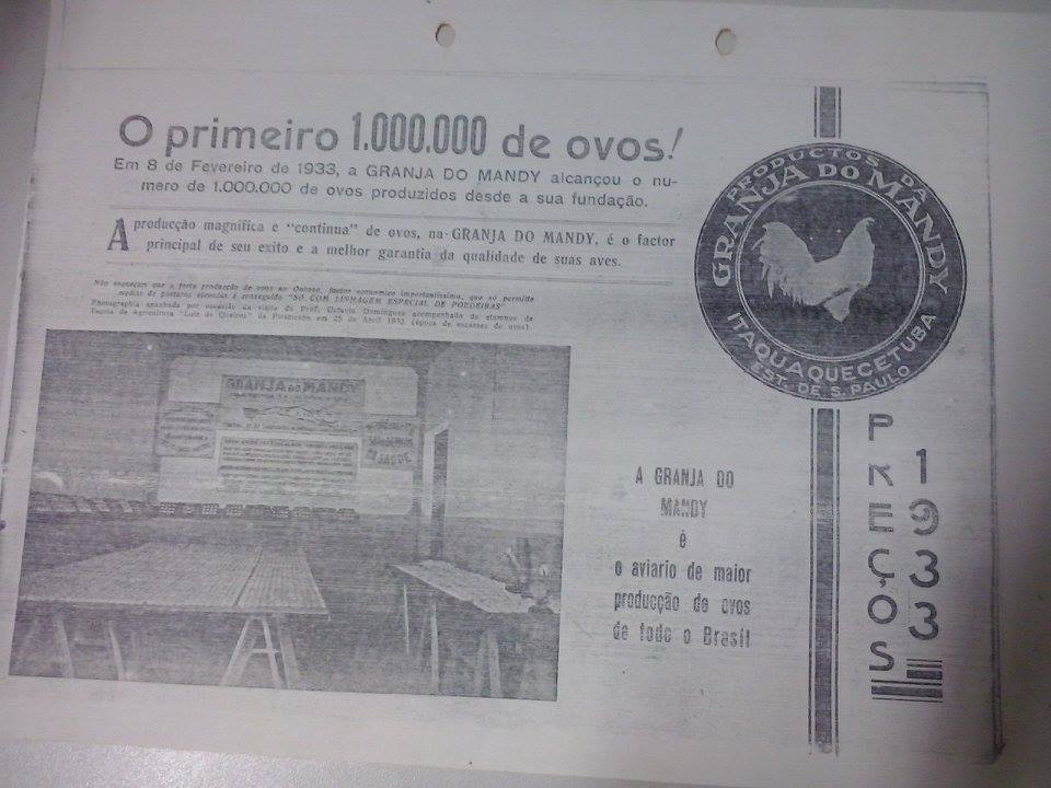 Nas prateleiras de qualquer supermercado há um pouco da história de Itaquaquecetuba. Alimento comum no prato dos brasileiros, os ovos brancos foram introduzidos no País na famosa Granja do Mandy, instalada em 1925 na estrada que hoje leva o nome da propriedade. Quem trouxe as galinhas Legorne à cidade foi o engenheiro agrônomo francês Charles Desiré Toutain, que produzia ovos brancos em linha genética, para que só fossem comercializados alimentos perfeitos. Para isso, ele utilizava um ovoscópio. Ele foi o primeiro avicultor a produzir em escala comercial na cidade.